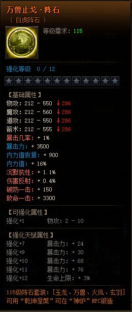 现在我们将为大家带来全新的115级至尊阵石:(青龙)玉龙奔雷·阵石、(白虎)万兽止戈·阵石、(朱雀)火凤焚天·阵石、(玄武)玄羽赤霄·阵石