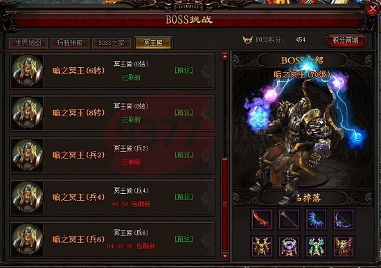 玩家可在BOSS挑战的冥王殿界面内查看暗之冥王的刷新情况,以免白走一趟。