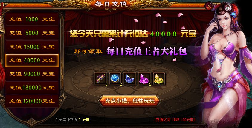充值40000元宝可领取的每日充值礼包内容包括: